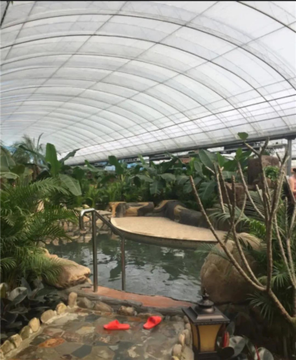 溫泉內(nèi)各種功能性泡池,包涵游泳池,大型漂流河,按摩池,兒童戲水池等20余個(gè),室外泡池3個(gè),大型豪華游泳池,海南風(fēng)情的綠色植物覆蓋的超級(jí)氧吧,空氣清新,香蕉樹,荔枝,芒果等等,水果樹科普展示,一年四季如畫,小橋流水,詩情畫意的浪漫生活品味,熱炕可同時(shí)容納200人。
