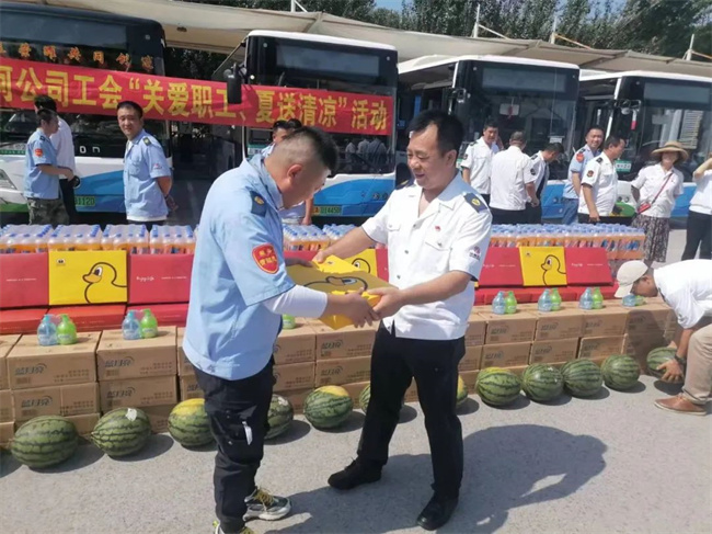 7月26日是二伏的第一天,酷暑難當。黃河公司由工會牽頭、領導班子帶隊,在西江街公交樞紐站開展了“關愛職工、夏送清涼”活動?;顒又?,公司領導班子將購置的飲料、礦泉水、浴巾、毛巾、西瓜、洗手液等防暑降溫及清潔物品,分發(fā)給公司公司所屬14個車隊的22條線路、及機關、車間。