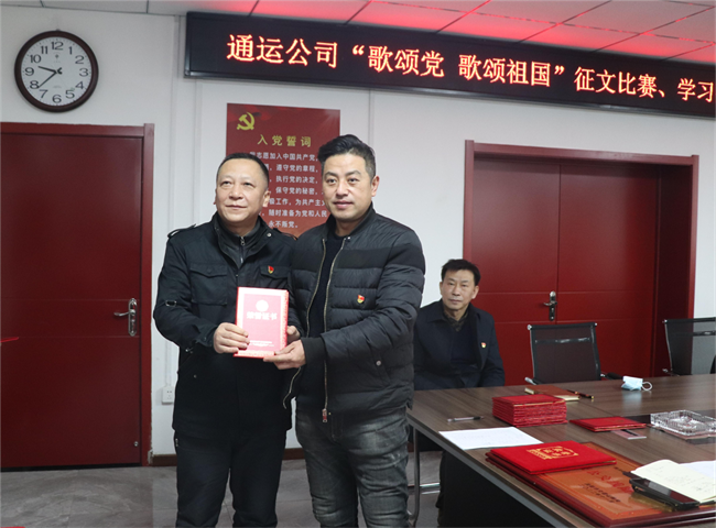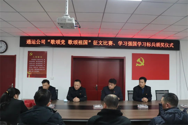 1月12日上午,通運公司在一樓會議室召開“歌頌黨 歌頌祖國”征文比賽、學(xué)習(xí)強國學(xué)習(xí)標(biāo)兵頒獎儀式,公司領(lǐng)導(dǎo)班子及各支部書記、獲獎職工代表參加,共30余人。