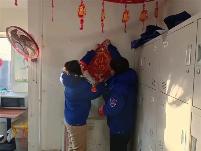 貼對(duì)聯(lián)、掛福字,通運(yùn)公司駕駛員歡喜過(guò)大年。