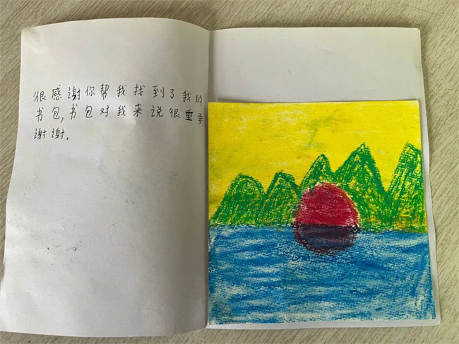 打開這封信,是一封由小朋友自己親手制作的感謝信,信中寫道:“很感謝你在后座上看見我的書包,我和我的同學(xué)在車上的時(shí)候太開心了,下車時(shí)就忘記了,非常感謝?!薄昂芨兄x你幫我找到了我的書包,書包對我來說很重要,謝謝?!?/p>