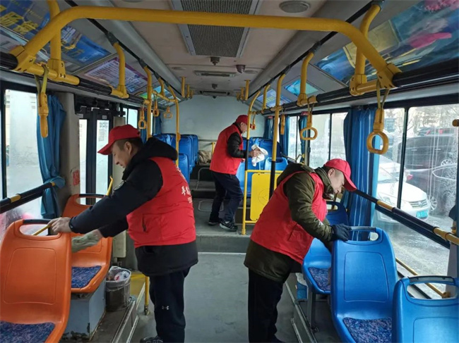 132.229.253路黨支部全體黨員及積極分子兵分兩路,清潔運營車輛、清理場區(qū)及始發(fā)站候車廊衛(wèi)生,為乘客提供整潔舒適的乘車環(huán)境。