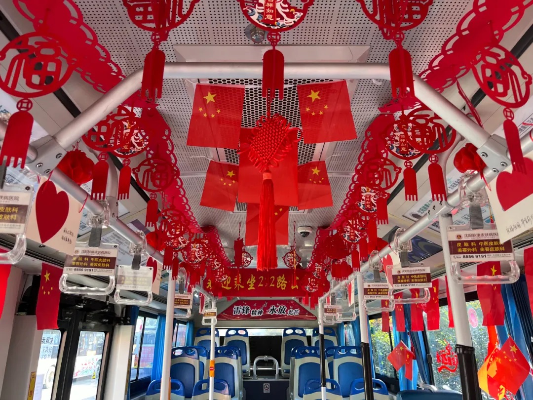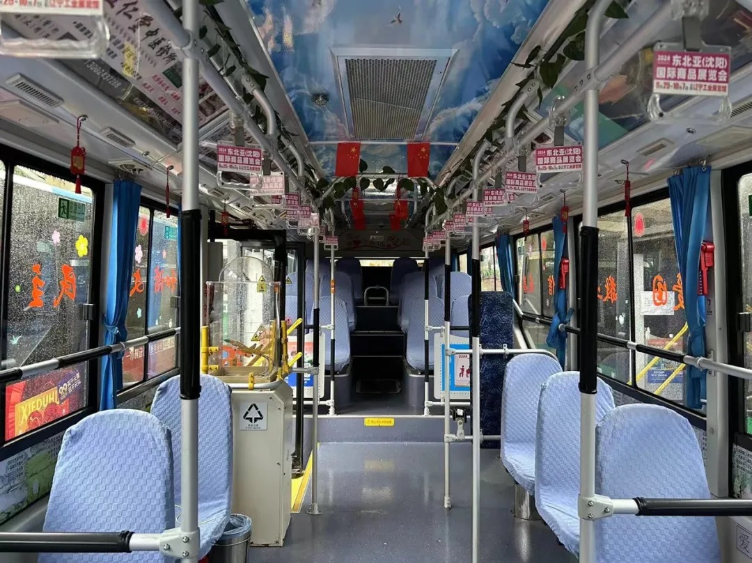 場面三:在沈陽市勞動模范、260路駕駛員繆立眾的車廂內(nèi),紅彤彤的國旗懸掛車廂兩側(cè),一句句祝福寄語祖國,讓市民在乘車時也感受到濃厚的愛國情懷。