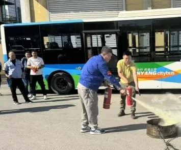 培訓(xùn)之后,在場人員來到公司院內(nèi)進行實地綜合演練。針對公交車輛突發(fā)火災(zāi)、乘客攜帶易燃易爆物品乘車等情況,駕駛員如何緊急停車、疏散乘客、使用滅火器進行撲救、處置危險品等方面進行了演練。