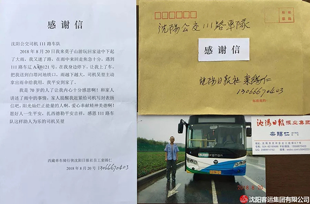 8月20日下午,沈陽突降大雨,鑫暢巴士v111路駕駛員吳堃駕駛公交車駛至莫子山公園附近時(shí),看到一位老人在路邊徘徊,全身已被雨水澆透。雖然老人沒有在站點(diǎn)位置等車,但吳堃見老人狀態(tài)不佳,于是將車??吭诼愤?。走近后見老人臉色慘白,嘴唇已經(jīng)沒了血色,便關(guān)切地詢問道,老人稱自己迷了路,找不到回家的方向了。于是吳堃第一時(shí)間將老人帶回了車隊(duì),找來干毛巾把老人身上的雨水擦干,喝了熱水后老人逐漸緩了過來。原來,老人姓欒,家住五愛街,到莫子山公園游玩,突然下起了雨,他趕緊往山下跑,卻因新修路不熟悉路形而迷失了方向。
