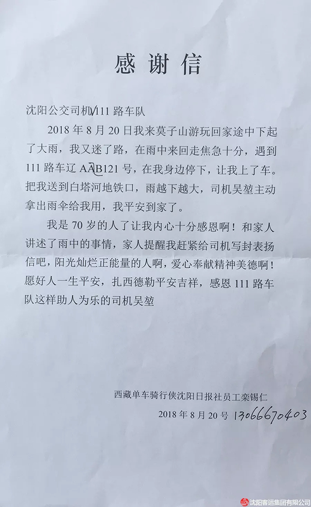 27日一大早,老人來到了鑫暢公司V111車隊(duì),送來了一封感謝信!見到吳坤第一句話就說:“太感謝你了小伙子,如果你那天沒看見我,不送我坐地鐵回家,我今天一定不會安好的站在這里…”說著老人流出了感激的淚水。