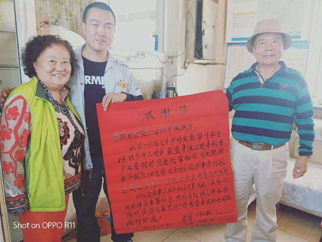 兩天后,老人攜同老伴,將一封寫滿真情的感謝信送到了通利公司256車隊(duì)。老人說:“當(dāng)天舊疾復(fù)發(fā),非常危急,萬幸救護(hù)及時(shí)才沒有釀成悲劇?!睋?jù)悉,在經(jīng)過短暫治療后,老人不顧阻攔,堅(jiān)持要親自來到公交車隊(duì)對(duì)孟超同志表達(dá)感謝,并請(qǐng)求車隊(duì)領(lǐng)導(dǎo)對(duì)孟超這種救死扶傷的高尚品德提出鼓勵(lì)與表揚(yáng)。老人在站務(wù)室等待了近兩個(gè)小時(shí),才將這份真誠(chéng)的謝意親自交到了駕駛員孟超的手上。