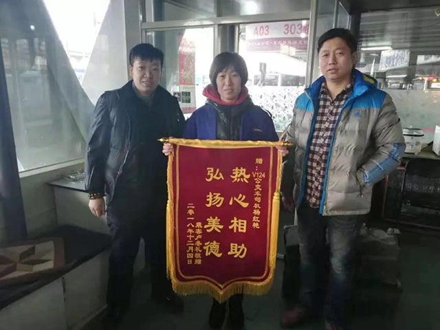 次日,盧女士懷著激動的心情,手里捧著錦旗來到龍之夢終點站,親自將錦旗交給了楊紅艷手中并合影留念。