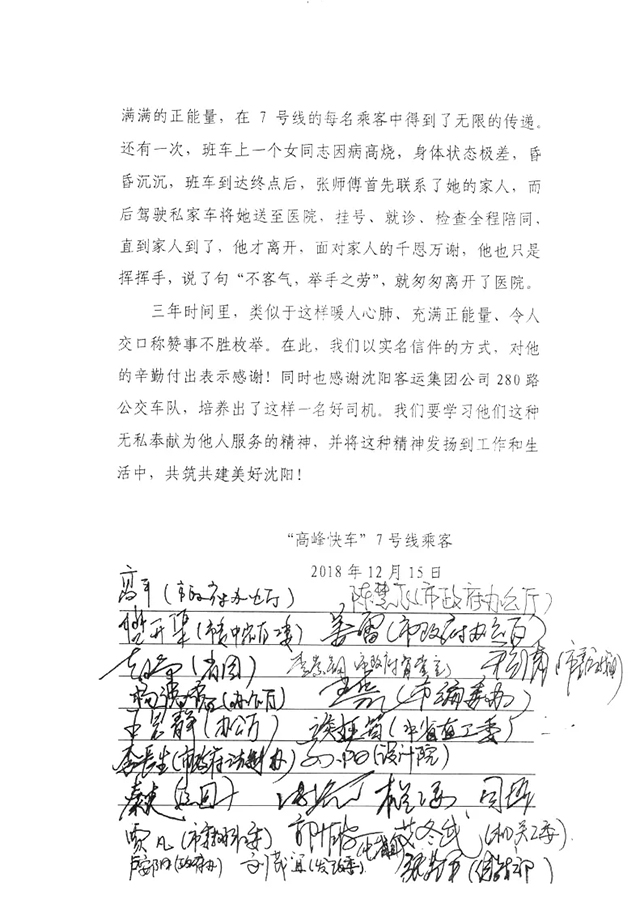 信的內(nèi)容是,贊揚280路駕駛員張嘎的好人好事。為乘客提供了防曬窗簾、雨傘等用品,而且工作中拾到的錢包、手機、公文包等重要物品都能做到拾金不昧。對待持老年證及孕婦乘客主動幫其找座位。對待病患人員則用心照顧,盡力滿足他們的條件和要求。不僅如此,每天利用休息時間多次對車輛進行清掃和檢查,發(fā)現(xiàn)車輛隱患及時排除,保證安全運營。張嘎積極工作、文明駕駛、樂于助人、堅持365天微笑服務(wù),他的工作熱情感染著身邊每一名同事,同時讓車上的乘客也真實感受到他優(yōu)質(zhì)的服務(wù)。作為公交一份子,始終堅持“乘客至上”的原則。多年來,深深懂得肩上的重任,雖然沒有驚天動地的光輝業(yè)績,卻有任勞任怨、勤勤懇懇的敬業(yè)精神。